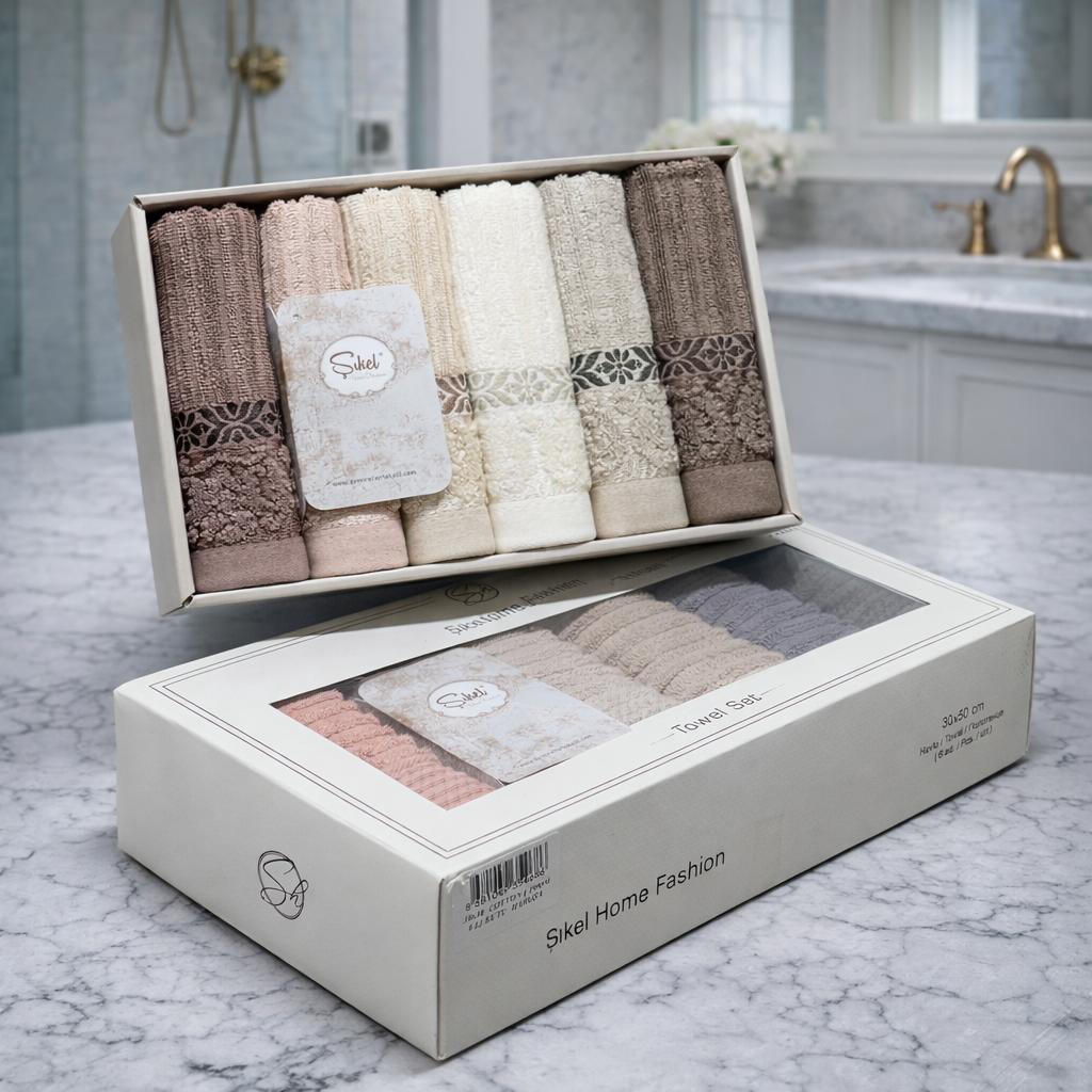 Découvrez le coffret de 6 serviettes invité Sikel, fabriquées en Turquie, pays reconnu pour son savoir-faire textile et la qualité exceptionnelle de son coton.